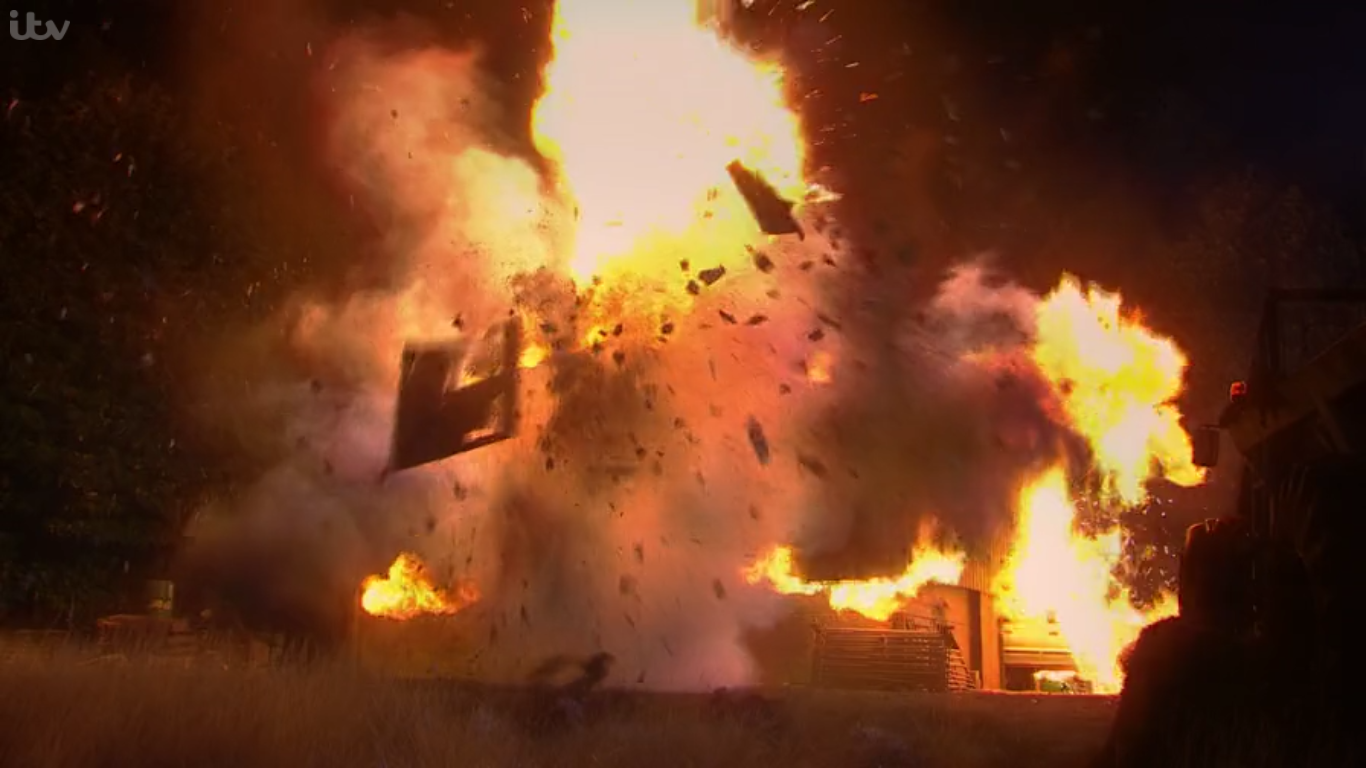 A barn at Butlers Farm is set alight by Emma Barton and Moira Dingle having an argument and explodes