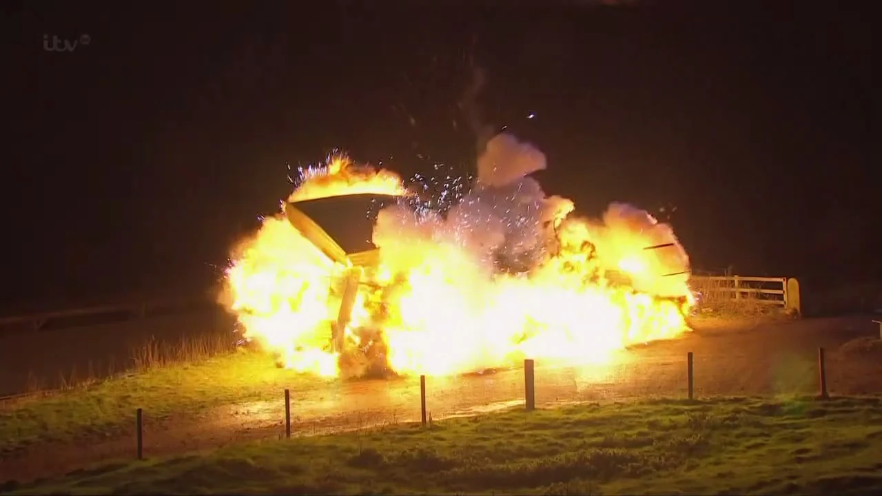 Robert blows up Katie and Andy's caravan.